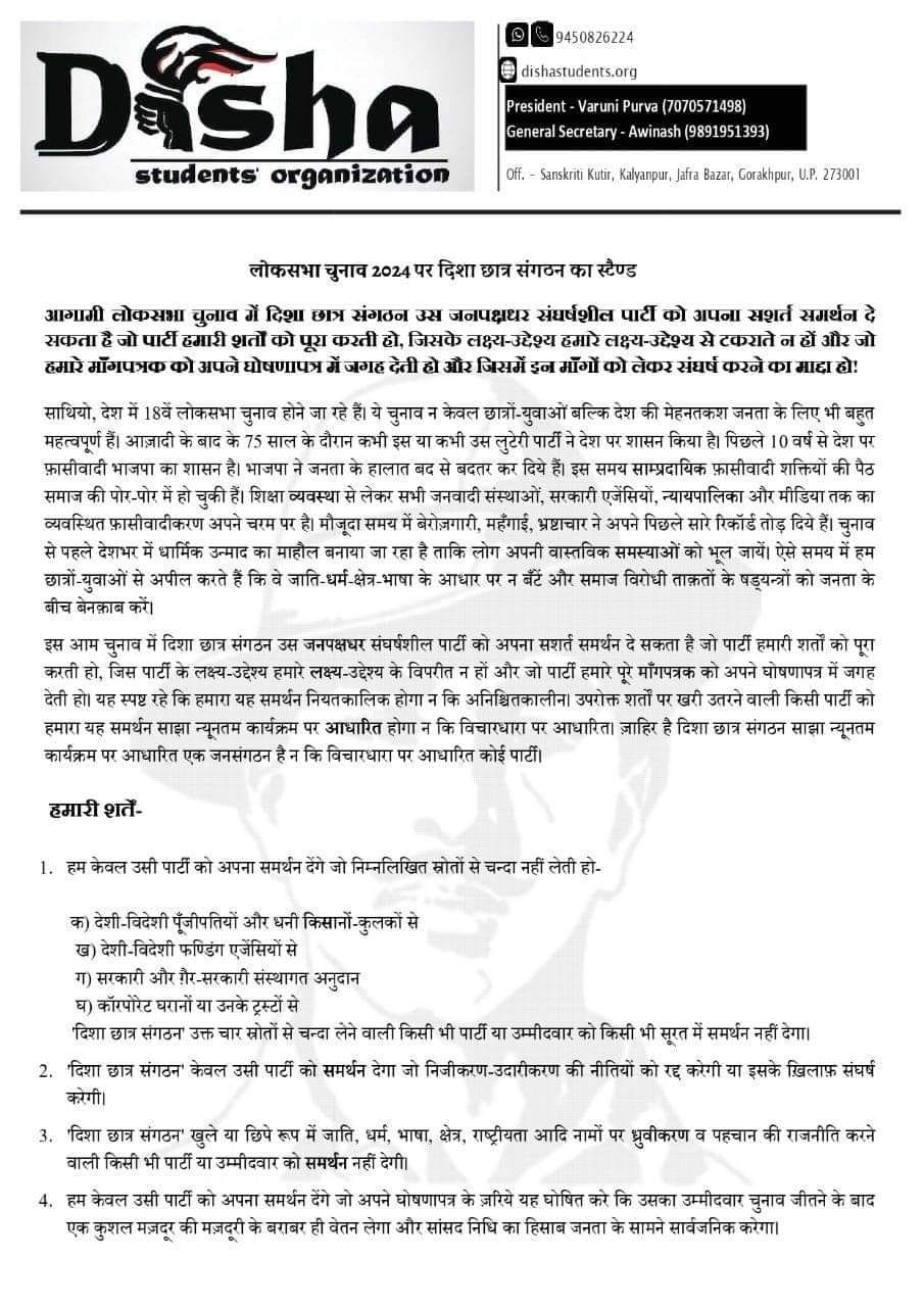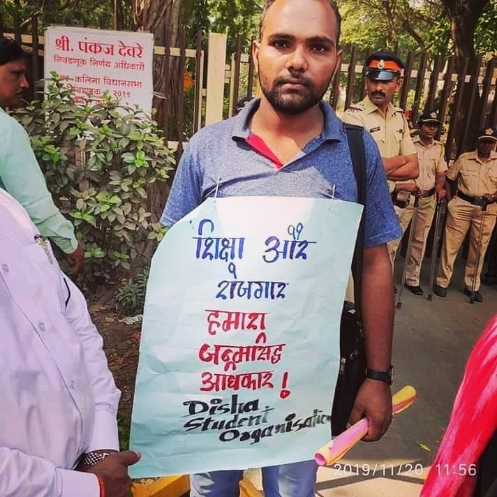 बंद करा शिक्षणाचा व्यापार! सर्वांना एकसमान आणि आणि निःशुल्क शिक्षण द्यावेच लागेल! दि.२०/११/२०१९ रोजी मुंबई विद्यापीठाच्या प्रवेश द्वारासमोर JNU विद्यार्थी संघर्षाच्या समर्थनार्थ निदर्शने करण्यात आली. दरम्यान जॉइंट एक्शन कमिटी फोर सोशल जस्टिस, दिशा विद्यार्थी संघटना आणि इतर सहयोगी संघटनांनी भागीदारी केली होती. दिशा विद्यार्थी संघटनेकडून अविनाश ने आपले म्हणणे मांडत सांगितले की JNU चे पूर्ण आंदोलन आणि त्यांच्या मागण्या आज खऱ्या अर्थाने समजून घेण्याची गरज आहे. तेव्हा आपल्याला सहज कळेल की, गेल्या सोमवारी विद्यार्थ्यावर दिल्ली पोलिसांकडून जो क्रूर लाठीचार्ज करण्यात आला तो किती अमानवी होता. हे आंदोलन फक्त एका विद्यापीठ पुरते मर्यादित नसून देशभरामध्ये शिक्षणाचे बाजारीकरण करण्यात येत आहे. या विरोधामध्ये आहे. देशभरातील विद्यार्थी आज वाढती फी व शिक्षणाचे बाजारीकरण इतर सोयीसुविधा या ग्राह्य मागण्या ला घेऊन आंदोलन करत आहेत. यात उत्तराखंड येथील मेडिकल कॉलेजचे विद्यार्थी, आयआयटी, टाटा इन्स्टिट्यूट ऑफ सोशल सायन्स आणि बनारस विद्यापीठ अशा अनेक जागेवर संघर्ष सुरू आहे. त्याच कडिमध्ये JNU मधील फि वाढ व नवीन हॉस्टेल नियमावली त्याचाच भाग आहे. अशामध्ये सर्व विद्यार्थ्यांनी एकमेकाच्या संघर्ष सोबत उभे राहत या विद्यार्थी संघर्षाला देशातील कामगार कष्टकरी जनतेपर्यंत घेऊन गेली पाहिजे. तेव्हाच जनता देखील शिक्षणाचे महत्त्व समजून या संघर्षाच्या पाठीशी नक्कीच उभीच राहील. येणाऱ्या काळात देखील बीजेपी, आरएसएस यासारख्या सांप्रदायिक फासिस्ट शक्तींना रोखण्यासाठी विद्यार्थी संघर्ष महत्त्वाची भूमिका नक्कीच बजावेल. हेसुद्धा आपण या ठिकाणी समजून घेतले पाहिजे. विरोध निदर्शने संपल्यानंतर दिशा विद्यार्थी संघटनेच्या कार्यकर्त्यांना बांद्रा-कुर्ला कॉम्प्लेक्स पोलीस स्टेशन यांनी विद्यापीठ परिसरांमधून अटक केली. व करियर उद्ध्वस्त करण्याच्या धमक्या देण्यात आल्या. दरम्यानच अनेक सामाजिक कार्यकर्ते व नागरिकांनी पोलीस स्टेशन वर फोन करून कार्यकर्त्यांना सोडण्यासाठी भडिमार सुरू केला. त्यावेळेस पोलिसांनी कार्यकर्त्यांना सोडून दिले यावरून हे नक्कीच समजले जाऊ शकते की, येणाऱ्या काळात सुद्धा विद्यार्थी आणि जनता एकमेकांच्या संघर्ष सोबत खंबीरपणे उभी राहण्याची अत्यंत गरज आहे. इंकलाब जिंदाबाद!